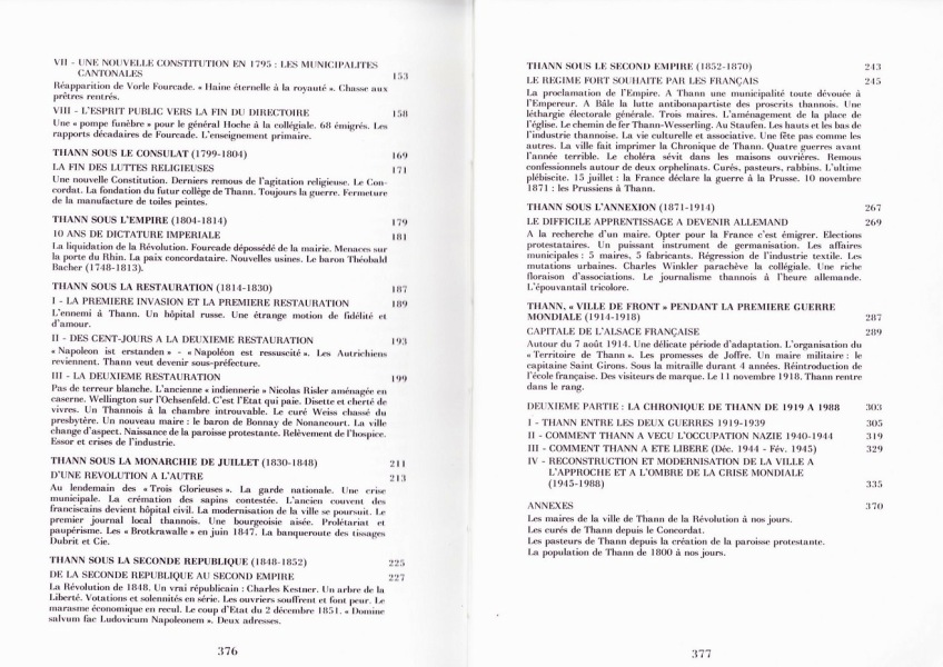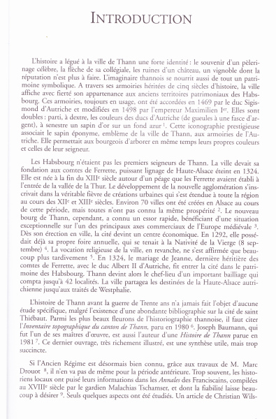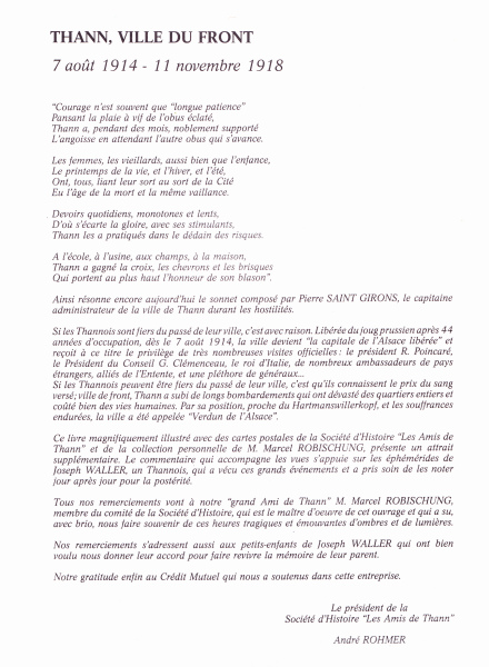 Son idée consistait à en faire un ouvrage qui replace la situation de Thann et des Thannois dans le cadre général de la Grande Guerre. Il montre clairement que, si la ville a accueilli des hôtes prestigieux, elle a aussi payé le prix du sang (morts, dévastations...). Il indique également comment la vie s'organise en ville sous les bombardements et comment le retour de l'école française est, non seulement, une image forte de la période, mais surtout une sorte de ciment entre les Thannois et la France.